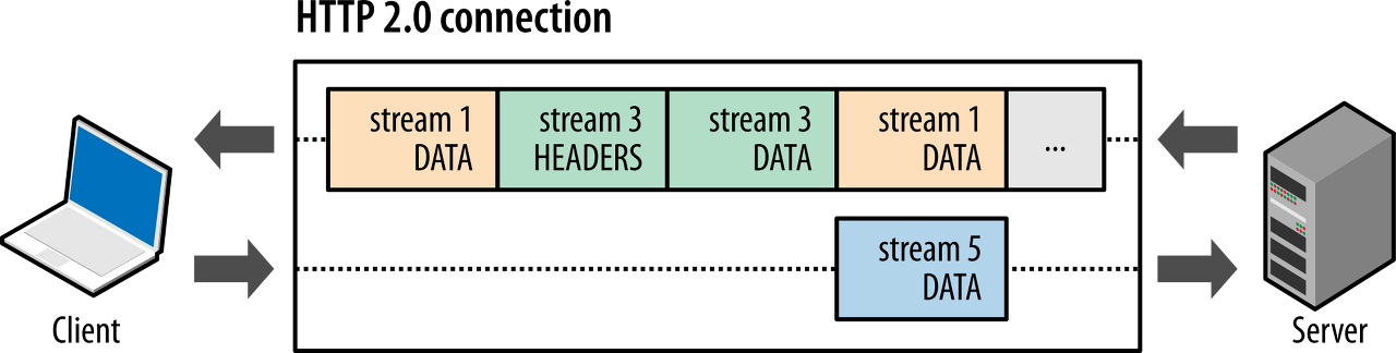 - ํ๋ ์(frame)์ด ๊ฐ ์์ฒญ์ ์คํธ๋ฆผ(stream)์ ํตํด ์ ๋ฌ๋๋ฉฐ, ํ๋์ ์ปค๋ฅ์ ์์ ์ฌ๋ฌ๊ฐ์ ์คํธ๋ฆผ(stream)์ ๊ฐ์ง ์ ์๊ฒ๋์ด ๋ค์คํ(multiplexing)๊ฐ ๊ฐ๋ฅํด์ง