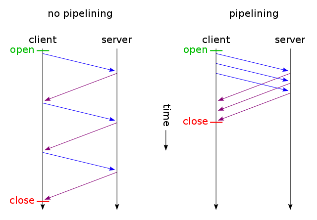 - HTTP/1.1์ Pipelining์ ํ๋ฒ์ ์ฐ๊ฒฐ์์ ์ฌ๋ฌ ์์ฒญ์ ๋ณด๋ผ ์๋ ์์์ง๋ง ๋์์ ์ฌ๋ฌ ์์ฒญ์ ์ฒ๋ฆฌํ์ง ๋ชปํ์