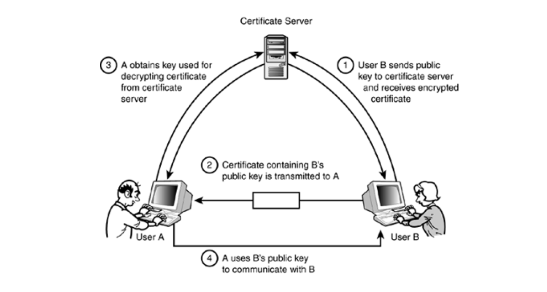 - User A๋ ์ธ์ฆ์์ ํฌํจ๋ ๊ณต๊ฐํค๋ก ๋ฉ์์ง๋ฅผ ์ํธํํด์ User B์๊ฒ ์ ๋ฌ