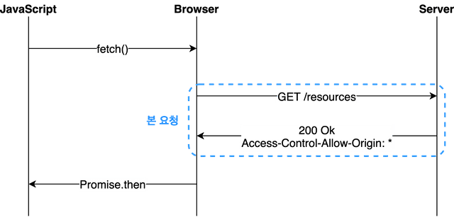 Originκ³Ό μλ΅ ν€λ μμAccess-Control-Allow-Originμ λΉκ΅Access-Control-Allow-Originμ Originμ΄ ν¬ν¨λλ€λ©΄ ν΄λΌμ΄μΈνΈλ‘ μλ΅ μ μ‘- ν¬ν¨λμ§ μλλ€λ©΄ λΈλΌμ°μ λ ν΄λΉ μλ΅μ λ²λ¦¬κ³ CORS μ μ± μλ° λ©μμ§λ₯Ό consoleμ μΆλ ₯