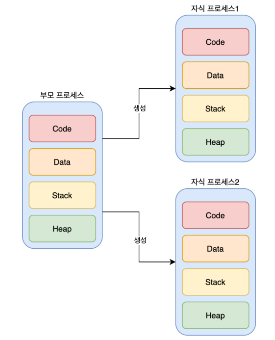- νλ‘μΈμ€λ κ°κ° λ 립λ λ©λͺ¨λ¦¬ μμ(Code, Data, Stack, Heap)μ ν λΉ λ°μ