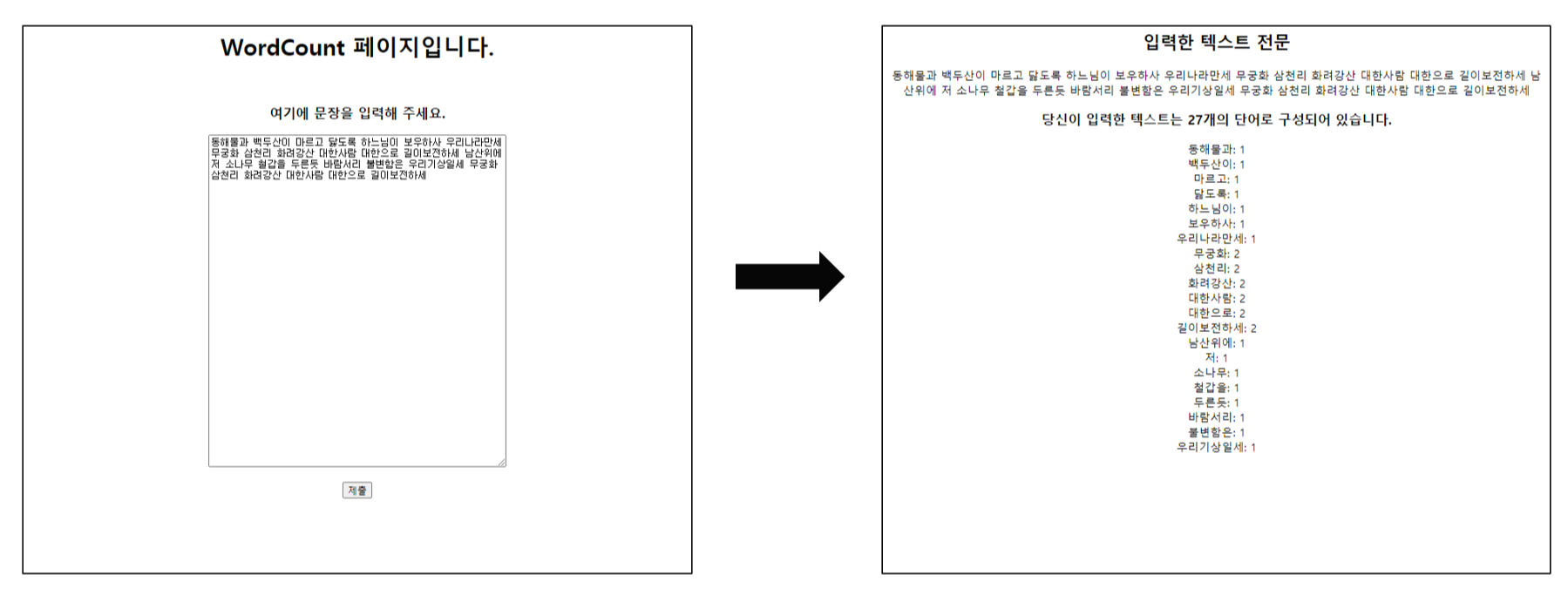 ๋ ฅ ์นธ์ ํตํด ๋ฌธ์์ด์ ์ ์ถํ๋ฉด ํด๋น ๋ฌธ์์ด์ ๋์ด์ฐ๊ธฐ ๋จ์๋ก ๋๋์ด ์ด ๋จ์ด์ ๊ฐ์์ ๊ฐ ๋จ์ด๊ฐ ์ฐ์ฌ์ง ํ์๋ฅผ ๊ณ์ฐํด ์ค๋ฅธ์ชฝ์ result.html์ ๋ณด์ฌ์ง๋๋ก ํ๋ ์ค์ต์ ์งํํ๋ค.