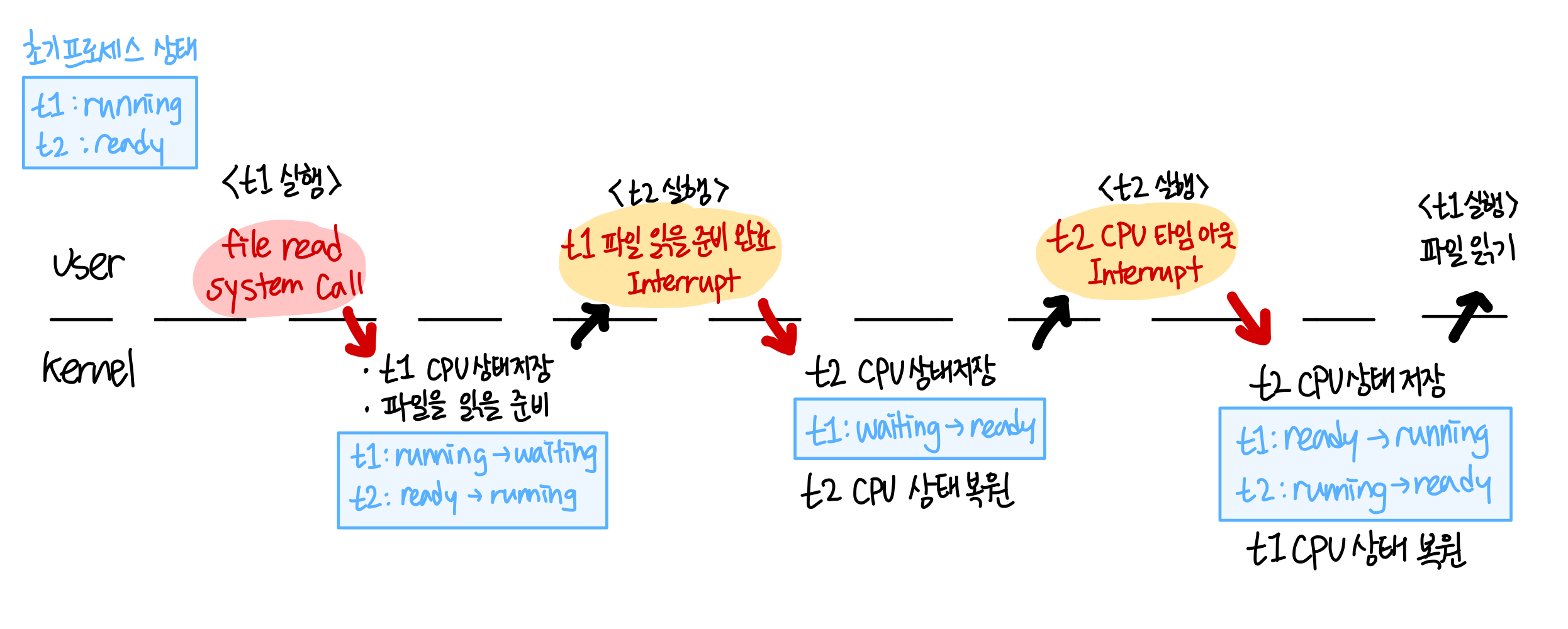 - μΈν°λ½νΈ μ νΈκ° λ€μ΄μ€λ©΄ CPUλ₯Ό μ κΉ μ μ§, μ¦κ°μ μΌλ‘ μΈν°λ½νΈλ₯Ό μ²λ¦¬νκΈ° μν΄ μ»€λ μ½λλ₯Ό 컀λ λͺ¨λμμ μ€ν