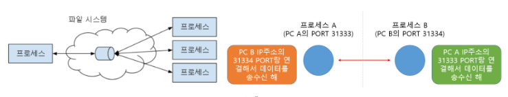 - ๋ฐ์ดํฐ ๊ตํ์ ์ํด ์์ชฝ PC์์ ๊ฐ๊ฐ ์์์ ํฌํธ๋ฅผ ์ ํ๊ณ ํด๋น ํฌํธ ๊ฐ์ ์ฐ๊ฒฐ์ ํตํด ๋ฐ์ดํฐ๋ฅผ ์ฃผ๊ณ ๋ฐ๋ ๋ฐฉ์