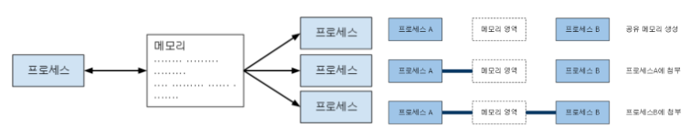 - ํ ํ๋ก์ธ์ค๊ฐ ๋ค๋ฅธ ํ๋ก์ธ์ค์ ์์์ ์ฌ์ฉํ๊ธฐ ์ํด ๋์์ ์ ๊ทผ ๊ฐ๋ฅํ ๋ฉ๋ชจ๋ฆฌ ์ฆ, ํ๋ก์ธ์ค๋ค์ด ๊ณต์ ํ๋ ๋ฉ๋ชจ๋ฆฌ๊ฐ ํ์