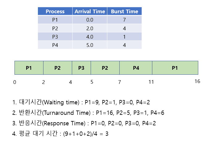 - ํ์ฌ ์คํ ์ค์ธ ํ๋ก์ธ์ค์ ๋จ์ ์๊ฐ๋ณด๋ค ๋ ์งง์ ์คํ ์๊ฐ์ ๊ฐ์ง ํ๋ก์ธ์ค๊ฐ ๋์ฐฉํ ๊ฒฝ์ฐ CPU๋ฅผ ๊ฐ์ ๋ก ํ์ํ์ฌ ๊ต์ฒดํ๋ ์๊ณ ๋ฆฌ์ฆ