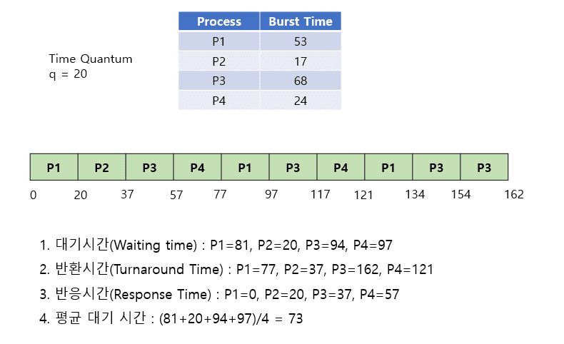 - n๊ฐ์ ํ๋ก์ธ์ค์ ๋ํด ํ ๋น ์๊ฐ์ด q๋ผ๋ฉด ์ด๋ค ํ๋ก์ธ์ค๋ (n-1)q ์ด์์ ์๊ฐ์ ๊ธฐ๋ค๋ฆฌ์ง ์์๋ ๋จ