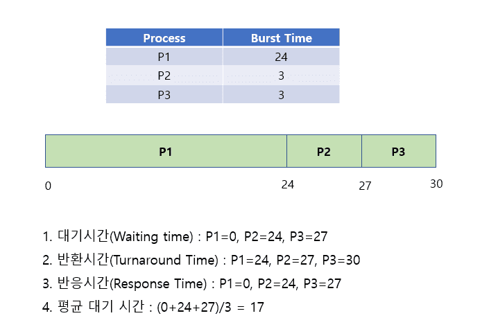 - ํ์ ๋์ฐฉํ ์์์ ๋ฐ๋ผ ๊ฐ์ฅ ๋จผ์ ์์ฒญํ ํ๋ก์ธ์ค์๊ฒ CPU๋ฅผ ํ ๋นํด์ฃผ๋ ์๊ณ ๋ฆฌ์ฆ