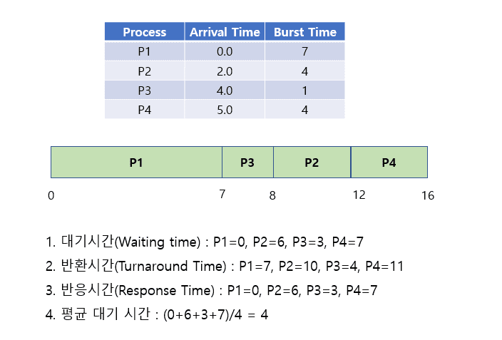 - ํ์ ๋์ฐฉํ ํ๋ก์ธ์ค ์ค ์คํ ์๊ฐ(Burst Time)์ด ๊ฐ์ฅ ์งง์ ํ๋ก์ธ์ค๋ฅผ ๋จผ์ ์คํํ๋ ์๊ณ ๋ฆฌ์ฆ