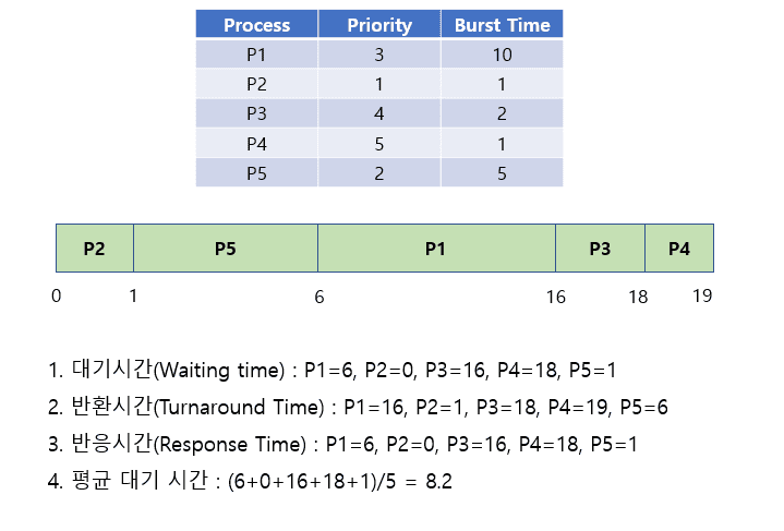 - ๊ฐ ํ๋ก์ธ์ค์ ์ฐ์ ์์์ ๋ฐ๋ผ ์ฐ์ ์์๊ฐ ๊ฐ์ฅ ๋์ ํ๋ก์ธ์ค์๊ฒ ๋จผ์ CPU๋ฅผ ํ ๋นํ๋ ์๊ณ ๋ฆฌ์ฆ