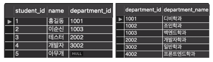 - ์ผ์ชฝ ํ ์ด๋ธ์ ๋ชจ๋ ๋ฐ์ดํฐ๋ฅผ ํฌํจํ๋ ๊ฒฐ๊ณผ ์งํฉ์ ์์ฑ