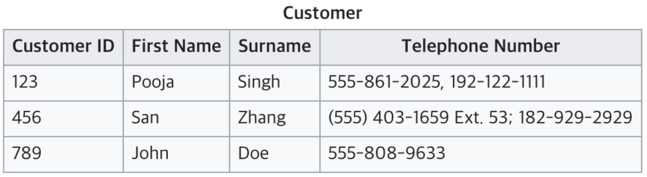 - ์ ๊ทธ๋ฆผ์ Telephone Number์ ๋ํด 2๊ฐ์ ๋ฐ๋ณต ์งํฉ์ ๊ฐ์ง๊ณ ์์ผ๋ฏ๋ก ์ 1์ ๊ทํ ๋ง์กฑ X