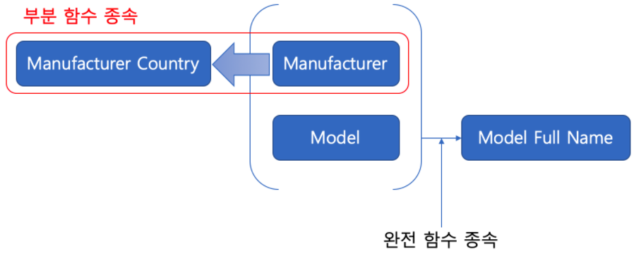 Model Full Name์ ๋ณตํฉํค์ธ Manufacturer์ Model์ ๋ํด ์์ ํจ์ ์ข ์์ ๋ง์กฑํ์ง๋ง Manufacturer Country๋ Manufacturer์ ๋ฐ๋ผ์๋ง ๊ฒฐ์ ๋๋ ๋ถ๋ถ ํจ์ ์ข ์ ๊ด๊ณ๋ฅผ ๊ฐ์ง