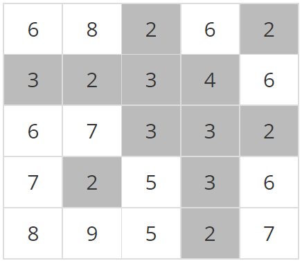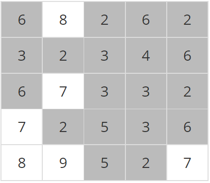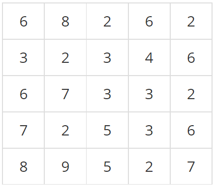 μ΄λ€ μ§μμ λμ΄ μ 보λ νκ³Ό μ΄μ ν¬κΈ°κ° κ°κ° NμΈ 2μ°¨μ λ°°μ΄ ννλ‘ μ£Όμ΄μ§λ©° λ°°μ΄μ κ° μμλ ν΄λΉ μ§μ μ λμ΄λ₯Ό νμνλ μμ°μμ΄λ€. μλ₯Ό λ€μ΄, λ€μμ N=5μΈ μ§μμ λμ΄ μ 보μ΄λ€.