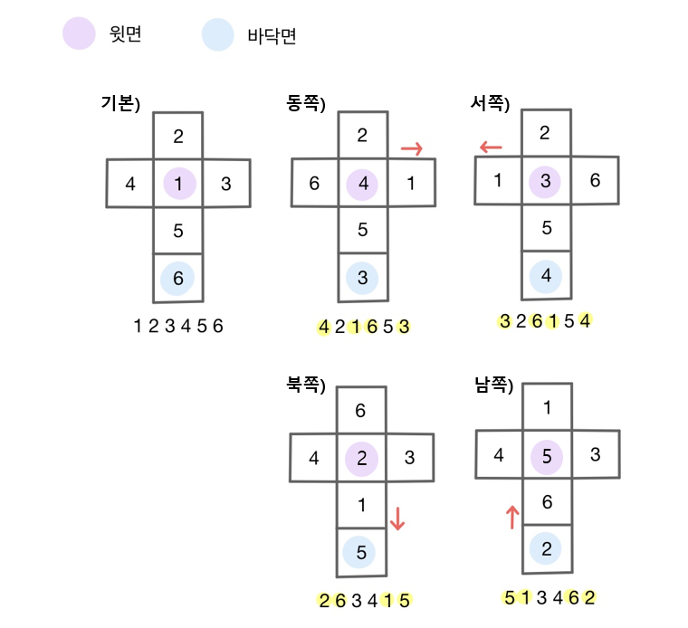 ์์ ๊ฐ์ด ์ฃผ์ฌ์๋ฅผ ๋, ๋ถ, ์, ๋จ ๋ฐฉํฅ์ผ๋ก ๊ตด๋ฆด ๋ ๊ฐ ์ฃผ์ฌ์ ์์น๊ฐ ์ด๋ป๊ฒ ๋ณํ๋์ง ๊ท์น์ ์ฐพ์ ๊ตฌํํ๋ค. ๊ทธ์ธ ๋ค๋ฅธ ์์ ์ ํฌ๊ฒ ์ด๋ ต์ง ์๋ค.