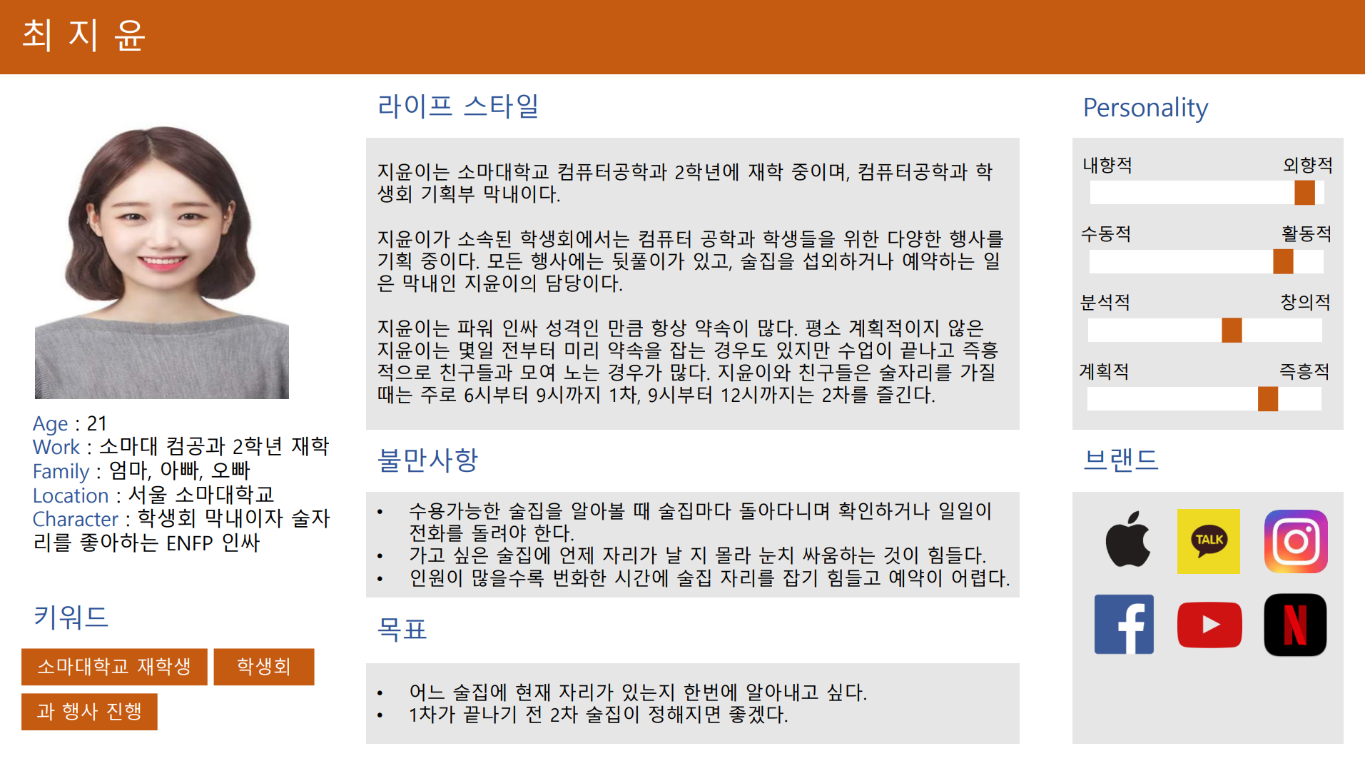 λ©ν λAμ μ½μΉ μλ νλ₯΄μλλ₯Ό μ€μ νκ³ μ μ μλ리μ€λ₯Ό μμ±νλ€. μ²μμλ μ κΌ μ μ μλ리μ€λ₯Ό μμΈνκ² μμ±ν΄μΌ νλ μ§ μ λͺ°λλ€. νμ§λ§ μ€μ§μ μΈ μ¬μ©μ μ νμΈ νλ₯΄μλκ° μΈμ μ΄λμ μ΄λ»κ² μλΉμ€λ₯Ό μ¬μ©ν κ²μΈμ§μ λ°λΌ κΈ°λ₯ λ° μ루μ λν μΌμ΄ λ¬λΌμ§ μ μμ΄ μ μ μλ리μ€λ₯Ό μμ±νλ κ³Όμ μ κ½€λ μ€μνλ€. λ¨Όμ , μ£Όμ μ μμ μ£Όμ μ΄μ©μ κ°κ°μ λννλ κ°μ μΈλ¬ΌμΈ νλ₯΄μλλ₯Ό ꡬ체μ μΌλ‘ μ€μ ν΄λ³΄μλ€. μ΄ν λ€μκ³Ό κ°μ΄ νλ‘νμ λ§λ€μ΄ μκ°ννλ€.