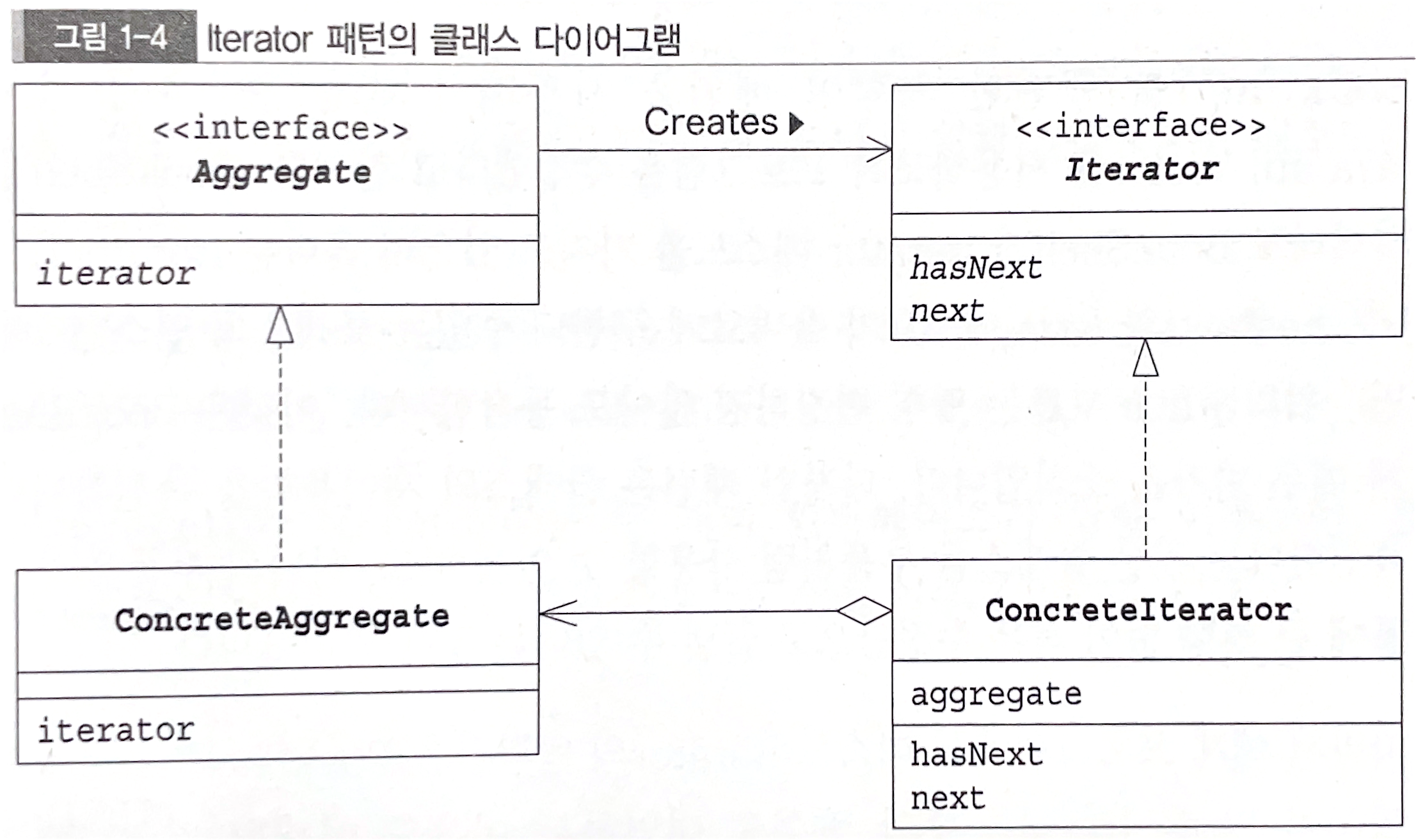 • μ§‘ν•© 객체의 λ‚΄λΆ€ ꡬ쑰λ₯Ό λ…ΈμΆœμ‹œν‚€μ§€ μ•Šκ³  λ°˜λ³΅ν•˜μ—¬ μˆœνšŒν•˜λŠ” 방법을 μ œκ³΅ν•œ νŒ¨ν„΄